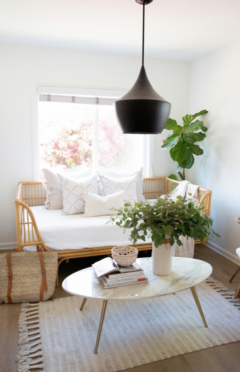 Pick out a pendant that contrasts with the palette of your space. This eclectic room is California cool in neutrals, but an oversized black metal light anchors the overall look, and the scale draws your eyes upward.