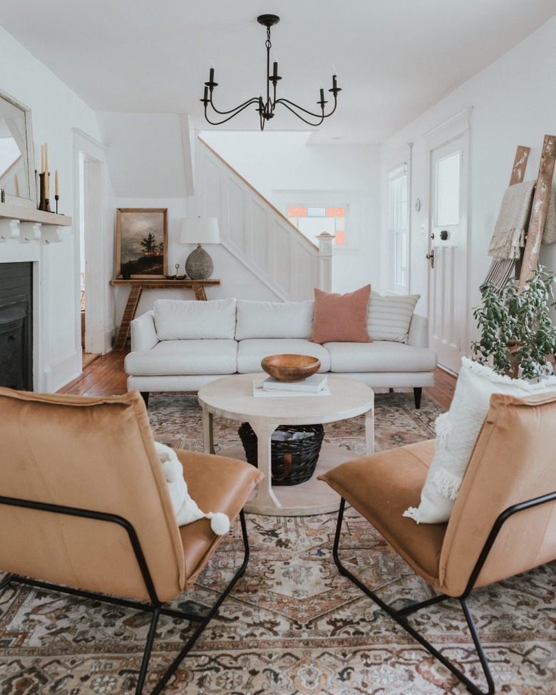 If you're into things being easy breezy with your living room decor, a chandelier doesn't have to be ultra-glamorous. Hang a wicker or cane look over your seating area to create a cozy and chic vibe with boho undertones. The neutral look works with countless decor styles.