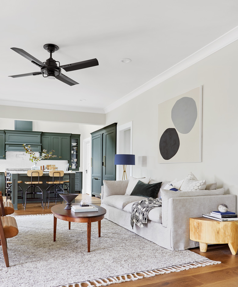 Instead of a simple white fan that would disappear into the ceiling, this industrial LED fan makes a strong visual statement and acts as a beautiful contrast to the more traditional choices elsewhere in the room.