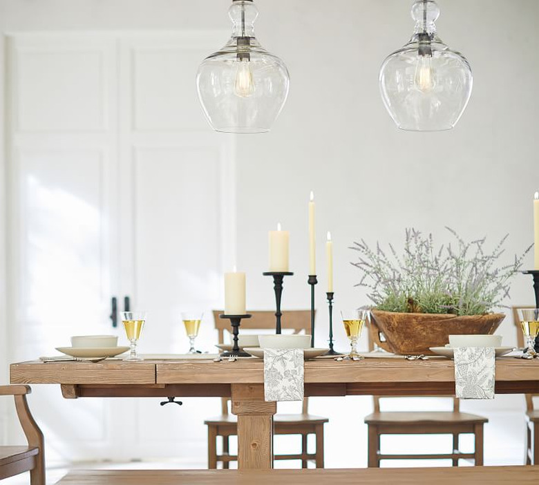 While you could argue — and be correct — that this type of fixture veers into the industrial style space, it's all about what you pair it with. Stick with unfinished wooden tables, lots of greenery, and natural hues and materials for a perfect farmhouse scene. Stay away from caged pendants and fixtures will a lot of steel to keep it from becoming too industrialized.