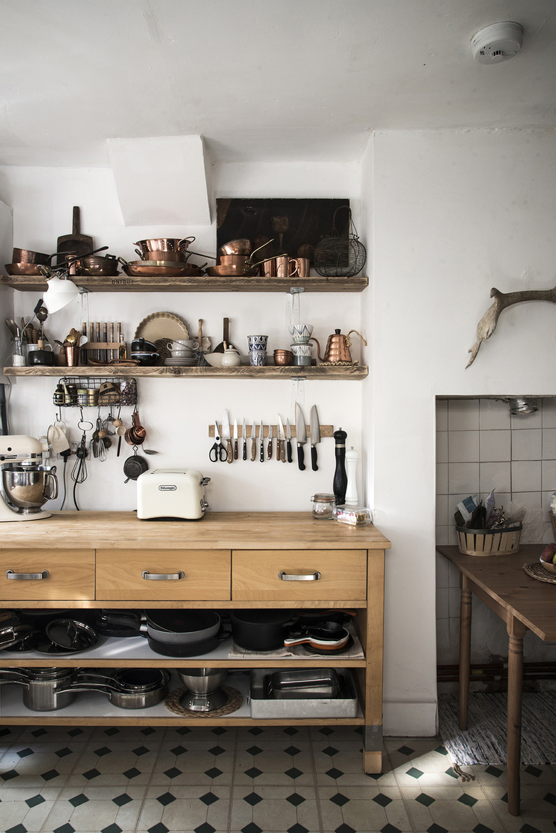 This rustic space makes great use of pegboard. It's an excellent choice if you like to switch up decor, since you can move shelves easily and choose new items to hang up as the seasons change.