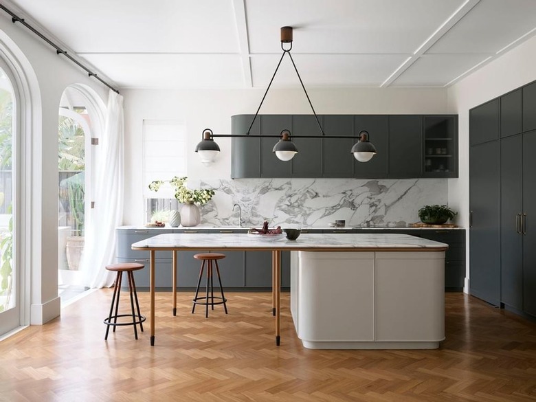 Keep your modern kitchen grounded by skipping out on upper cabinets — à la this design spotted on Entrance — for a more streamlined and minimalist finish. Make up for the lost storage space with a functional island or bring in a freestanding unit that can contrast the scheme with flair.