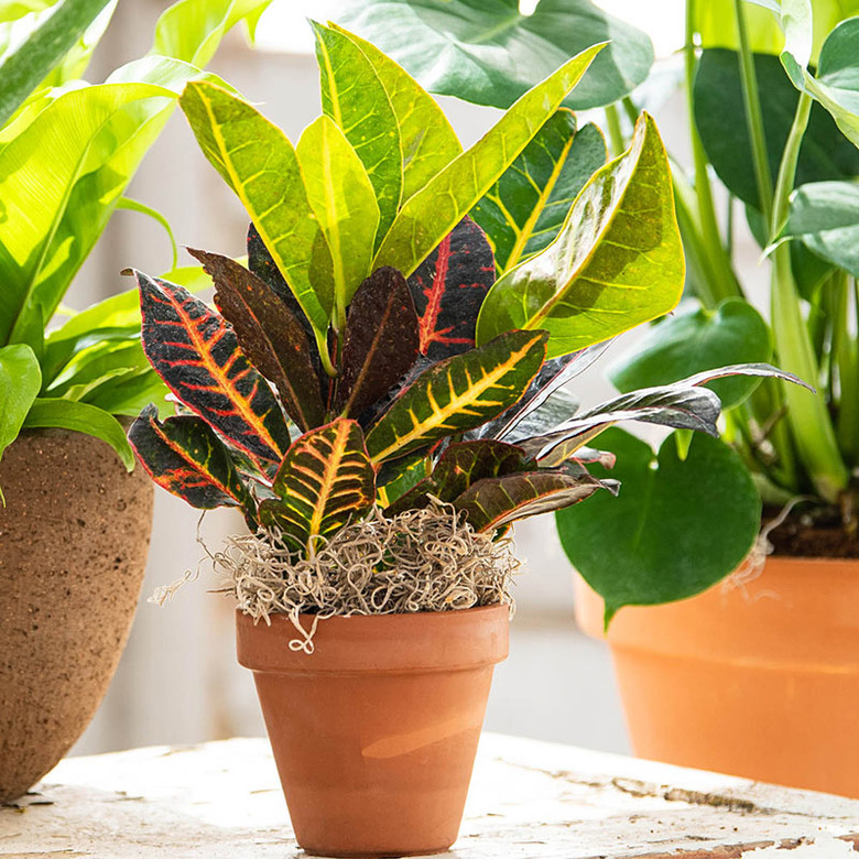 Big, bright leaves in bold patterns of yellow, orange, pink, red, and green: that's the trademark of the croton plant (Codiaeum variegatum pictum), although there are many varieties and innumerable cultivars, each with its own distinctive look. Few plants will give you such a bang for the buck of a welcome than the croton, with vibrant colors in joyful mixes. Try Petra for a plant with warm tropical hues and and exotic leaf patterns. Set a croton on a pebble tray on a table or shelf in the entryway, where it can get plenty of humidity and indirect light. Enjoy a fireworks welcome every time you walk in the door.