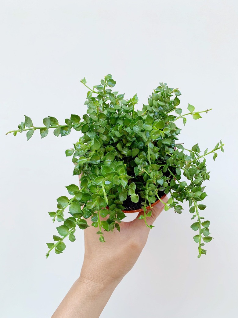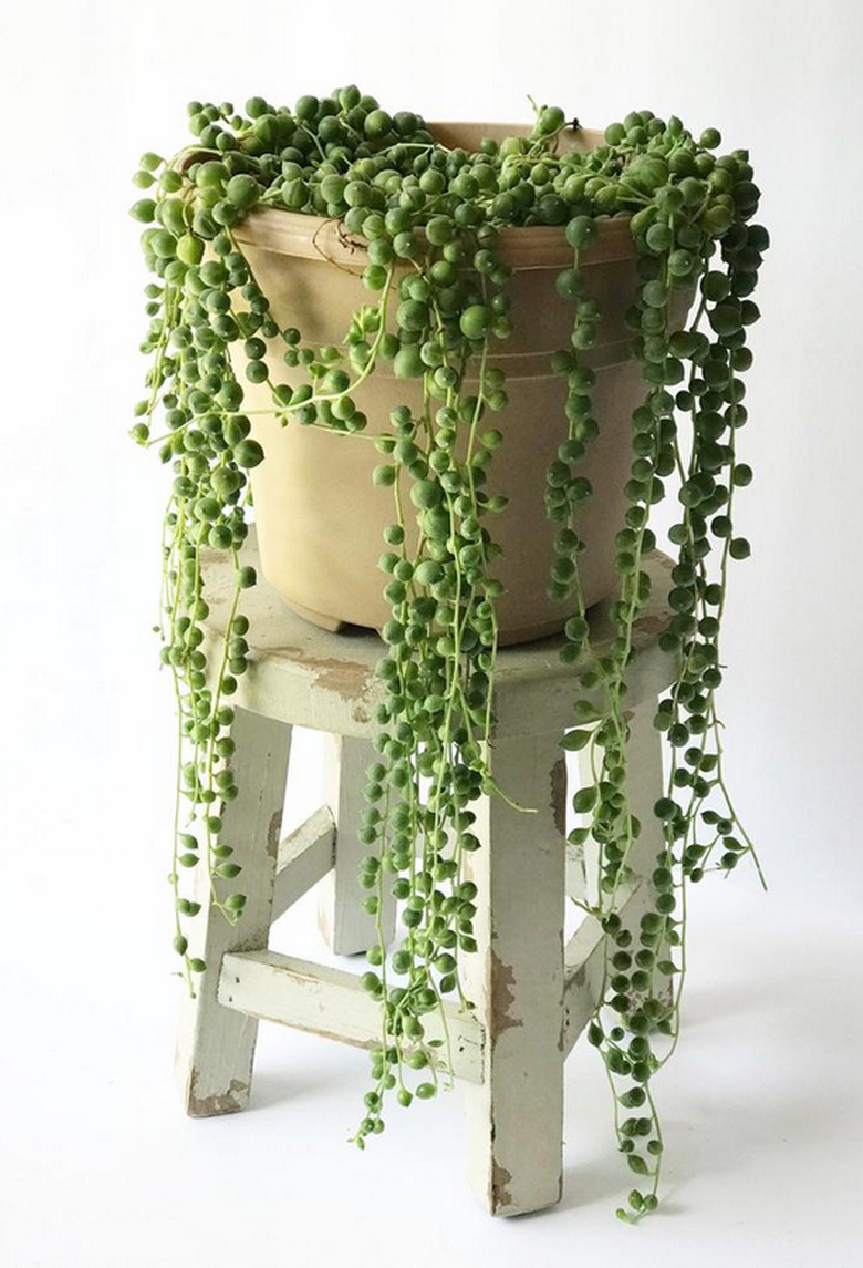 A string of pearls plant (Senecio rowleyanus) is just made to cascade from a handing basket in a well-lit entryway. This stand-out succulent from southwest Africa has trailing leaves like strings of pea-size beads that sway in the breeze. An elegant and unusual plant, string of pearls is drought tolerant and grows quickly with indirect light and occasional watering. You must allow the plant to dry out entirely between drinks.