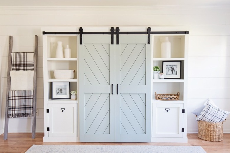 Today's homeowners want their living rooms to do double-duty — and sometimes that means you want to have a good old-fashioned conversation without a black mirror staring back at you. Angela from Angela Marie Made DIYed this pretty white entertainment stand, but her crowning achievement is the two barn doors that keep the TV hidden when not in use.