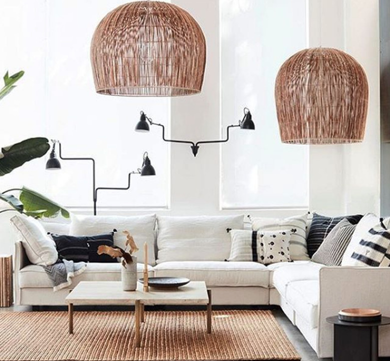 Make a real statement by pairing architectural light fixtures with oversize basket pendants for a look that's equal parts modern and tropical. This edited living room lighting idea is pared-down boho at its best. A woven area rug echoes the textured light shades and adds warmth from the ground up.