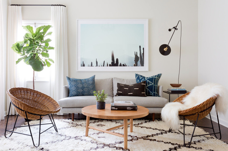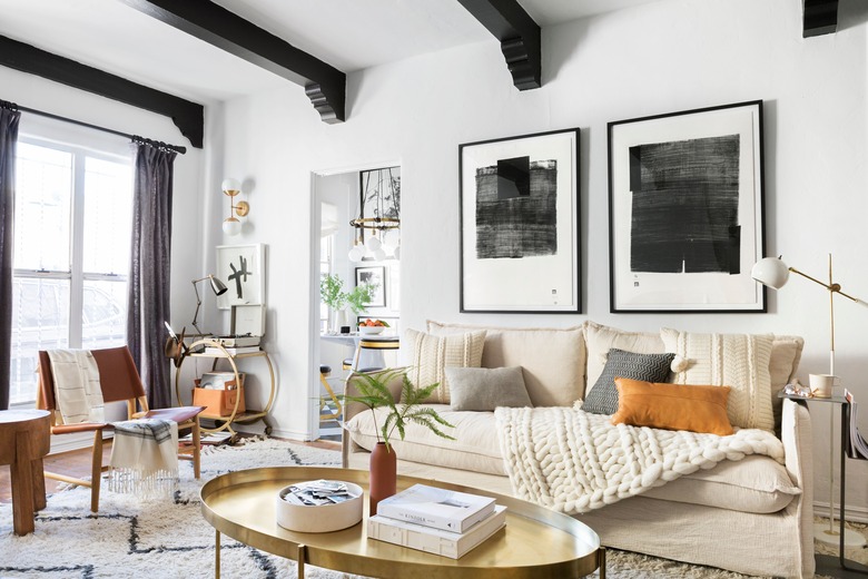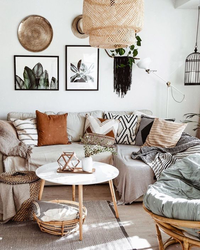 A chunky knit blanket can infuse a bohemian vibe into virtually any space. Here, Brady Tolbert over at Emily Henderson Design layers one in his monochromatic living room that's punctuated by refined details like a brass coffee table and graphic artwork for an elevated boho look. A combination of wall and floor lights with gold accents blend in seamlessly, while a beni ourain rug and leather chair add quintessential bohemian style.