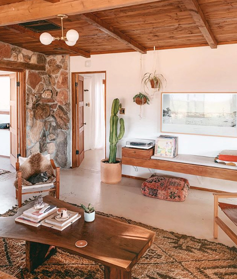 Soft earth tones and plenty of texture reign supreme in this boho haven. Take cues from The Joshua Tree House and select a diminutive pendant light that's practical without distracting. Because when you've got a great view working for you, your interior design can make a statement without working too hard. Hanging planters, a live-edge wood coffee table, and a Moroccan rug are staples that do wonders at transforming interiors into a bohemian paradise.