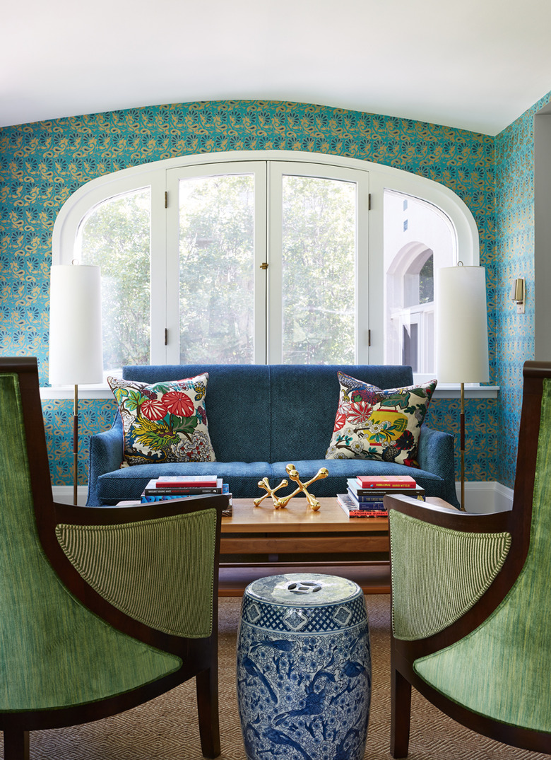 Be daring and mix striking wallpaper, traditional furniture silhouettes, and untraditional fabrics. This classically appointed sitting room by Fiddle Head Design Group takes an original direction with an Asian-inspired wallpaper print and furniture covered in a combination of denim and chartreuse. A Chinese garden stool used as a side table and bright color block print pillows add to the Eastern feeling and bring a formal sensibility to the casual material choices.