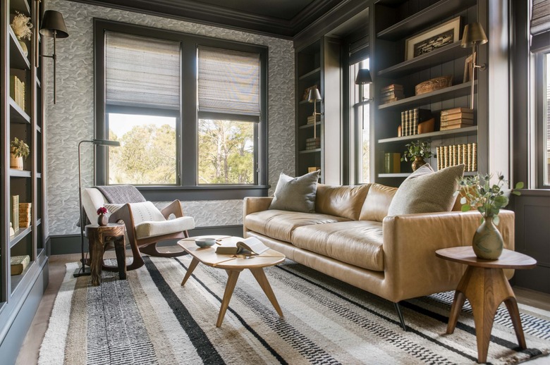 Add dimension to a cozy sitting room without diverting attention from floor-to-ceiling built-ins by applying a subtly patterned wallpaper, as seen in this handsome space by Courtney Bishop Design. A nubby stripe rug in a range of neutrals anchors the space, while a collection of sculptural wood furniture warms up the dark-hued walls.