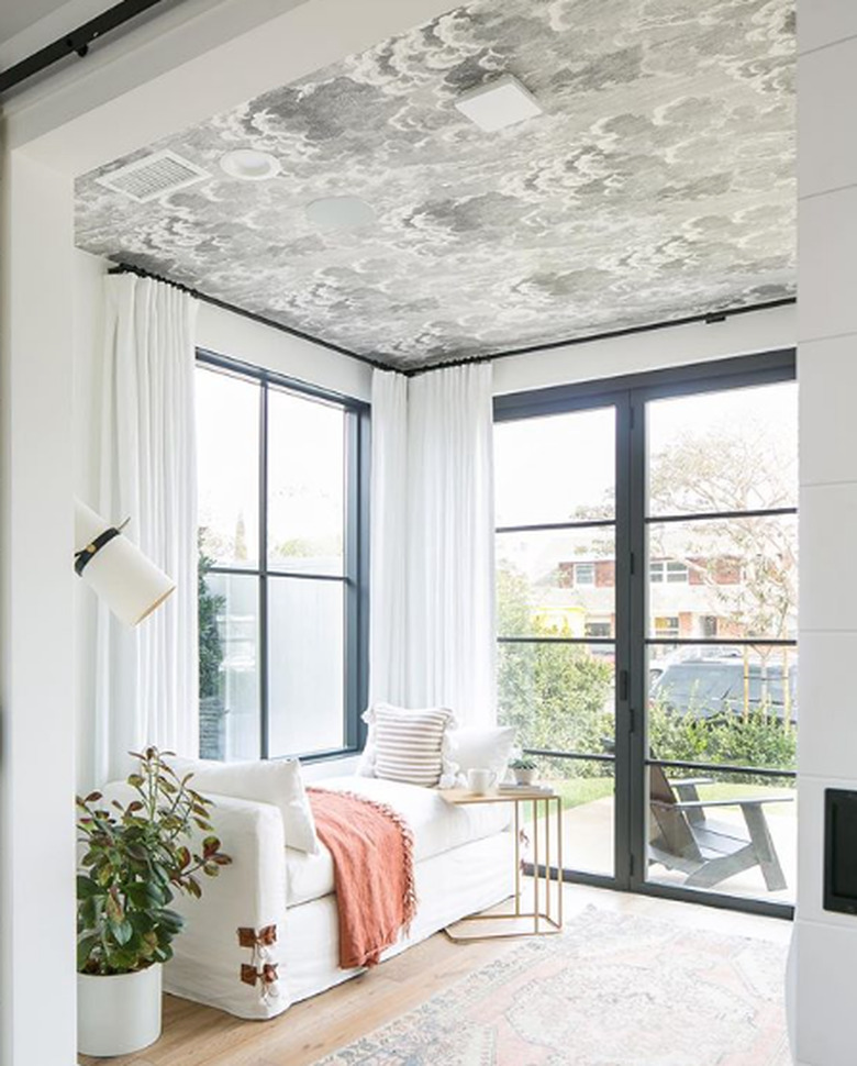 Most people focus on the walls of a living room, but adding wallpaper to the "fifth wall," or ceiling, is a great way to introduce color and pattern into a space without overwhelming it. sKout Design uses a monochromatic print to create drama from above and add interest to a muted color palette. A peach throw and Persian rug add warmth and a touch of contrast.
