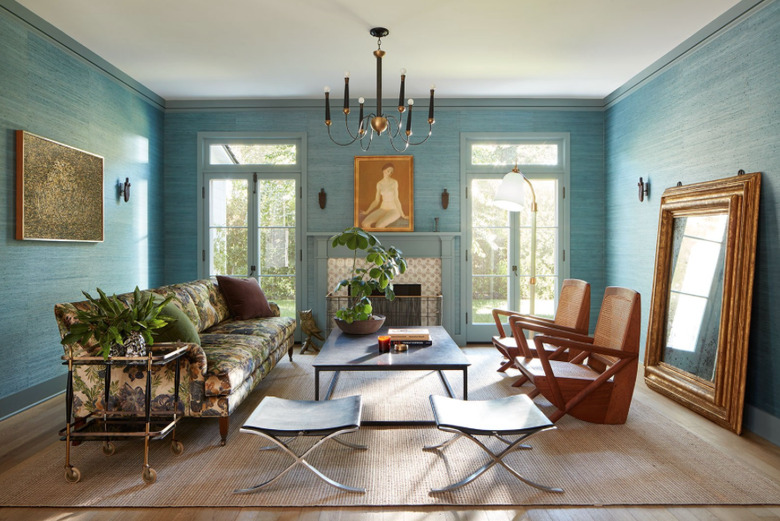 If you need a living room wallpaper idea that lets you ease into the world of wall finishes, embrace grasscloth. It's a great way to infuse color into any space without the commitment of an all-out pattern; it also adds a layer of texture and character that even the freshest coat of paint just can't compete with. Nickey Kehoe opted for a grasscloth in Tiffany blue to create a jewel-box of a room that starts with a neutral rug and is appointed with an assortment of one-of-a kind furnishings and artwork. A vintage chandelier grounds the entire space.