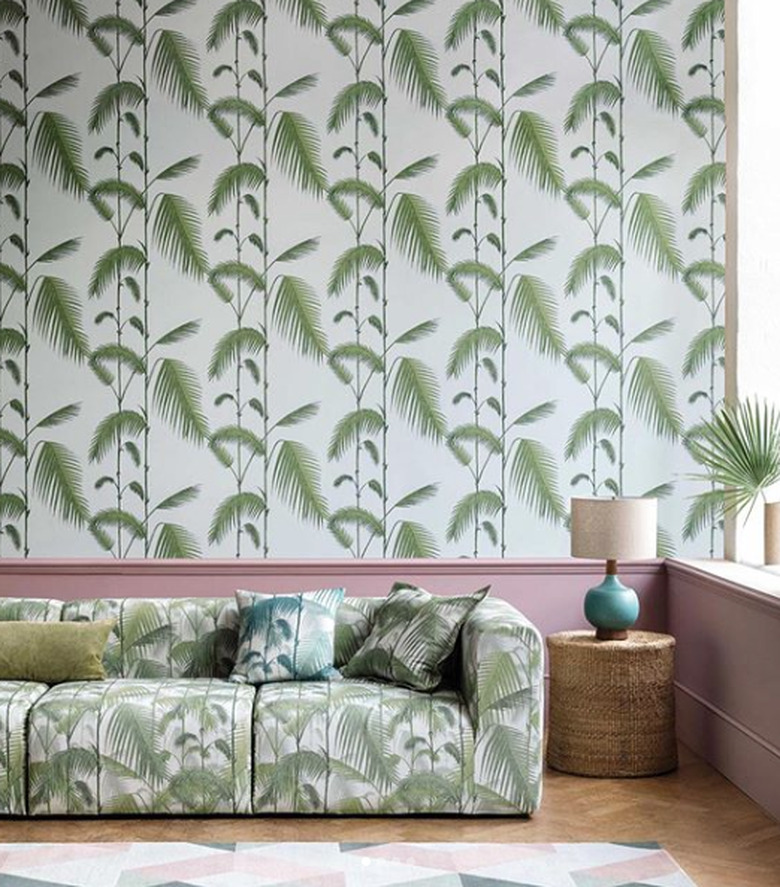When you discover a print you love, why not use it on your walls AND your furniture? Cole & Son's retro palm print is available in wallpaper and complimentary fabric, making it easy to coordinate your furniture with your walls. Because ... why not? When paired with pink wainscoting, this living room has a distinct '70s vibe, reminiscent of the iconic Beverly Hills Hotel. A woven side table enhances the tropical look.