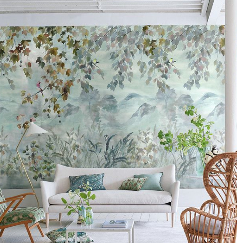 An ethereal landscape mural by Designers Guild does the heavy lifting in this living room and allows the rest of the design features to take a back seat. A pair of natural wood chairs add to the organic vibe and bring plenty of warmth to the otherwise neutral space. Living greenery sprinkled throughout has a trompe l'oeil effect, making it hard to distinguish between the real thing and the backdrop.