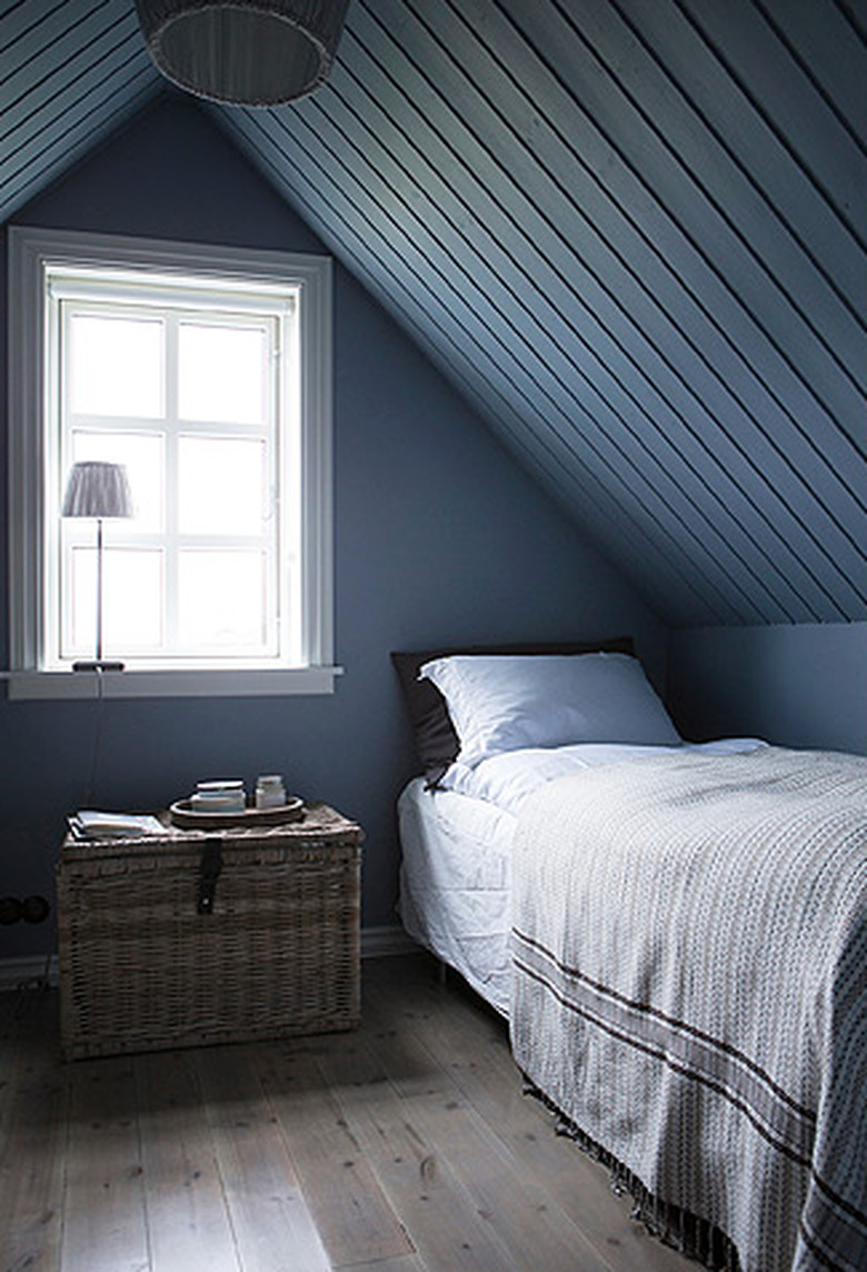 Don't fight it: Instead of competing with your outside environment, lean in to short winter days by painting your walls a moody and comforting bluish-gray. Dark interiors are so cozy, and the addition of a tongue and groove ceiling, wicker side table, and crisp linens infuse this bedroom idea seen on Boutique Homes Iceland with texture and approachability. Bare wood floors and a lack of heavy window treatments are quintessential Scandinavian design trademarks.