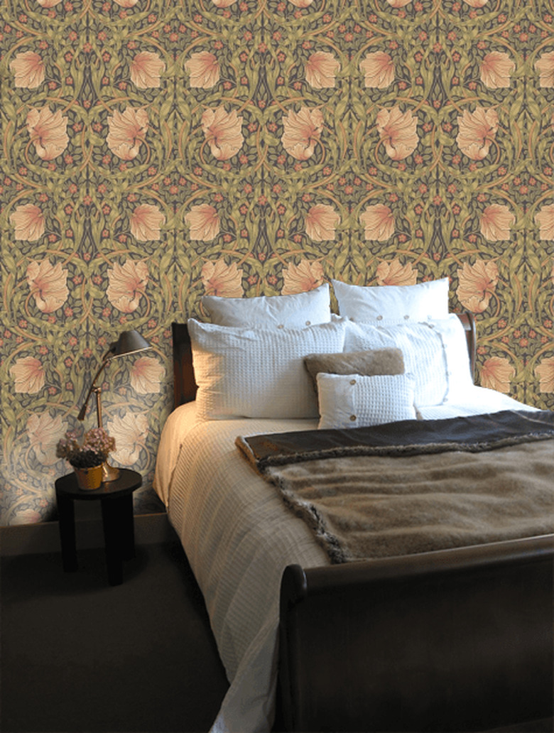 If you feel lost without pattern, we feel you. Luckily, pattern can be incorporated into a Scandi-inspired bedroom idea in a thoughtful way that isn't overwhelming, when balanced with simple furnishings and accessories. This setup seen at Fashion Wallpaper Co. features an old world floral print by British textile designer William Morris and is complemented by straightforward and utilitarian pieces like a wooden bed and articulating lamp.