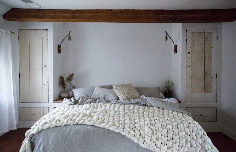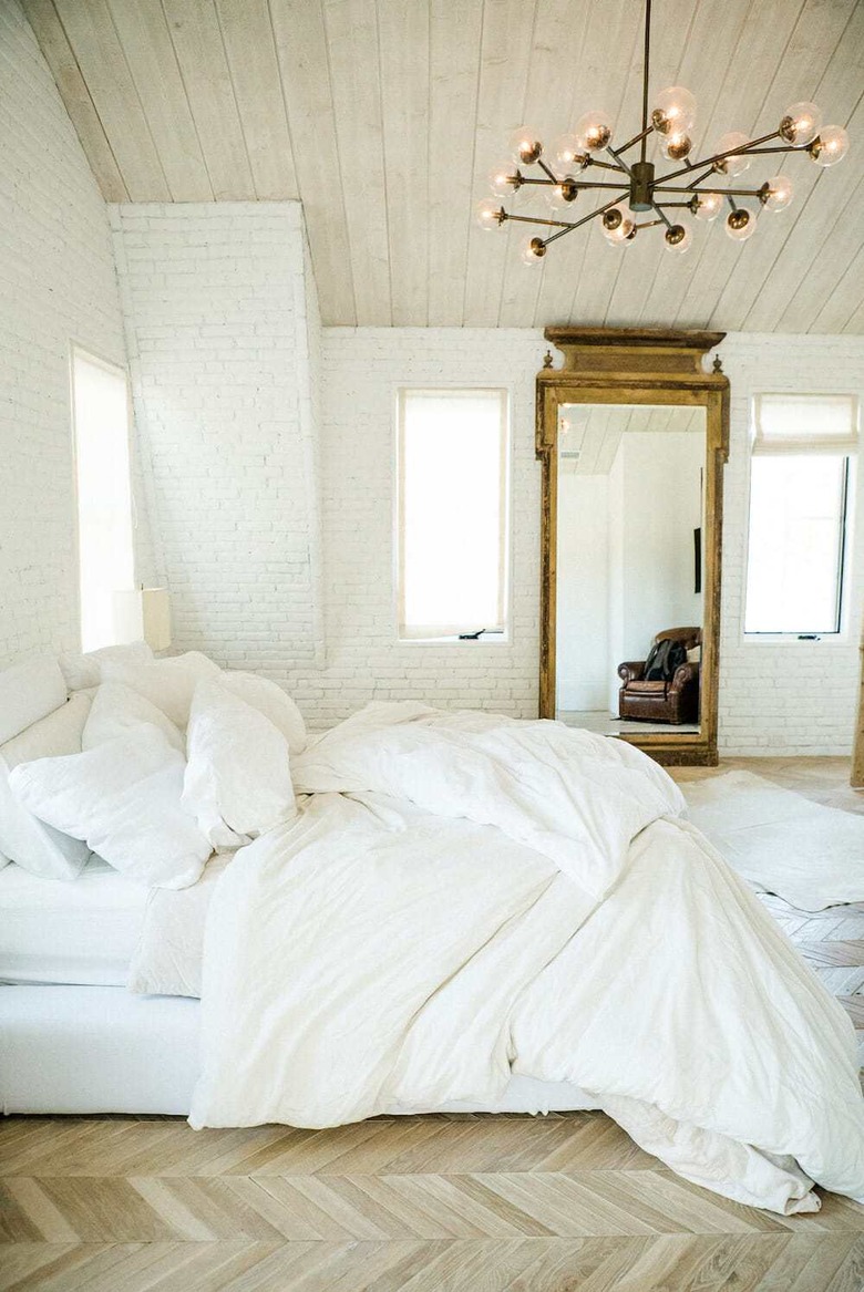 When you're working with a great foundation like chevron wood floors, tumbled brick walls, and a wide-beam wood ceiling, your decor can take a back seat. An all-white bedroom has plenty of depth when it includes textures and layers as this one by Leanne Ford does. Add a vintage mirror and a modern chandelier for character and originality without overwhelming the monochrome space.