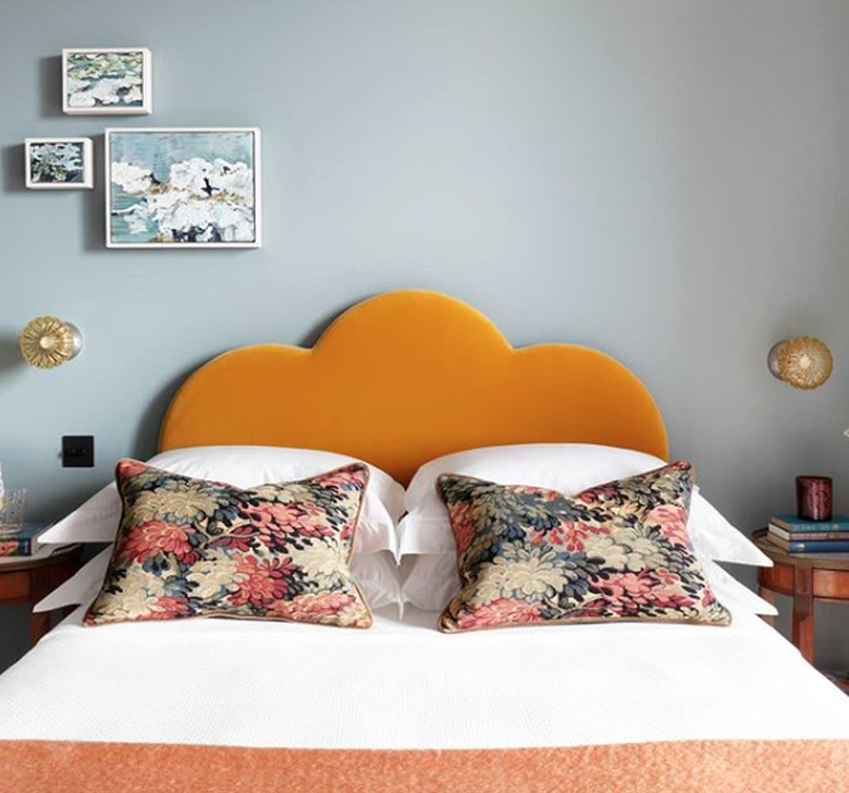 A Scandi bedroom idea doesn't HAVE to be completely void of color, just be sure to temper it with plenty of neutral elements like cool gray walls, white bedding, and wood side tables as Studio Ashby does in this space — rendering a scalloped orange velvet headboard more of a happy accent than a focal point. A pair of sconces and a trio of mini landscape paintings complete the look.