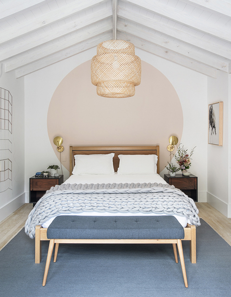 Jessica Helgerson's timeless spaces are considered, yet approachable and every piece in this pared-down bedroom is practical without sacrificing beauty. A large painted pink circle behind the bed anchors the space and creates a focal point, while plenty of texture and depth are incorporated with a woven pendant, thick throw, and brass sconces.