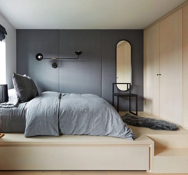 There's something youthful about a walk-up platform bed that we love. The bleached wood built-ins and flooring in this bedroom idea by Elizabeth Roberts Architecture are the yin to the yang of a soft, dark gray upholstered wall, fur rug, and bedding. Accessories like an oval mirror, simple accent chair, and architectural wall sconce are utilitarian and decorative.