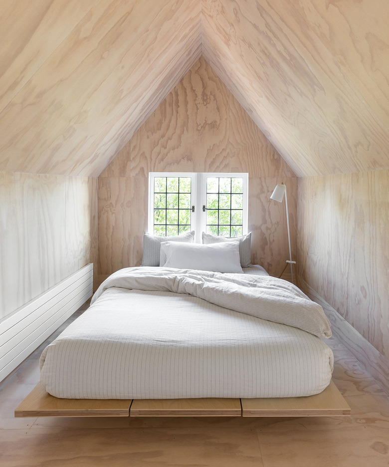 Cocoon yourself in floor-to-ceiling plywood for a grown-up tree house effect as seen in this space by NB Design Group. Nothing fancy here: Plenty of natural light, a simple platform bed, and a fluffy comforter work together to hit all the Scandi design high notes.