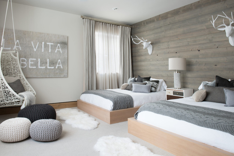 This bedroom idea by Reed Design Group takes a decided ski cabin bent with a feature wall adorned in wood and a set of plaster-cast deer busts. Icelandic sheep throw rugs are a welcome addition on cold mornings and a simple monochrome color scheme allows the textural components to stand out.