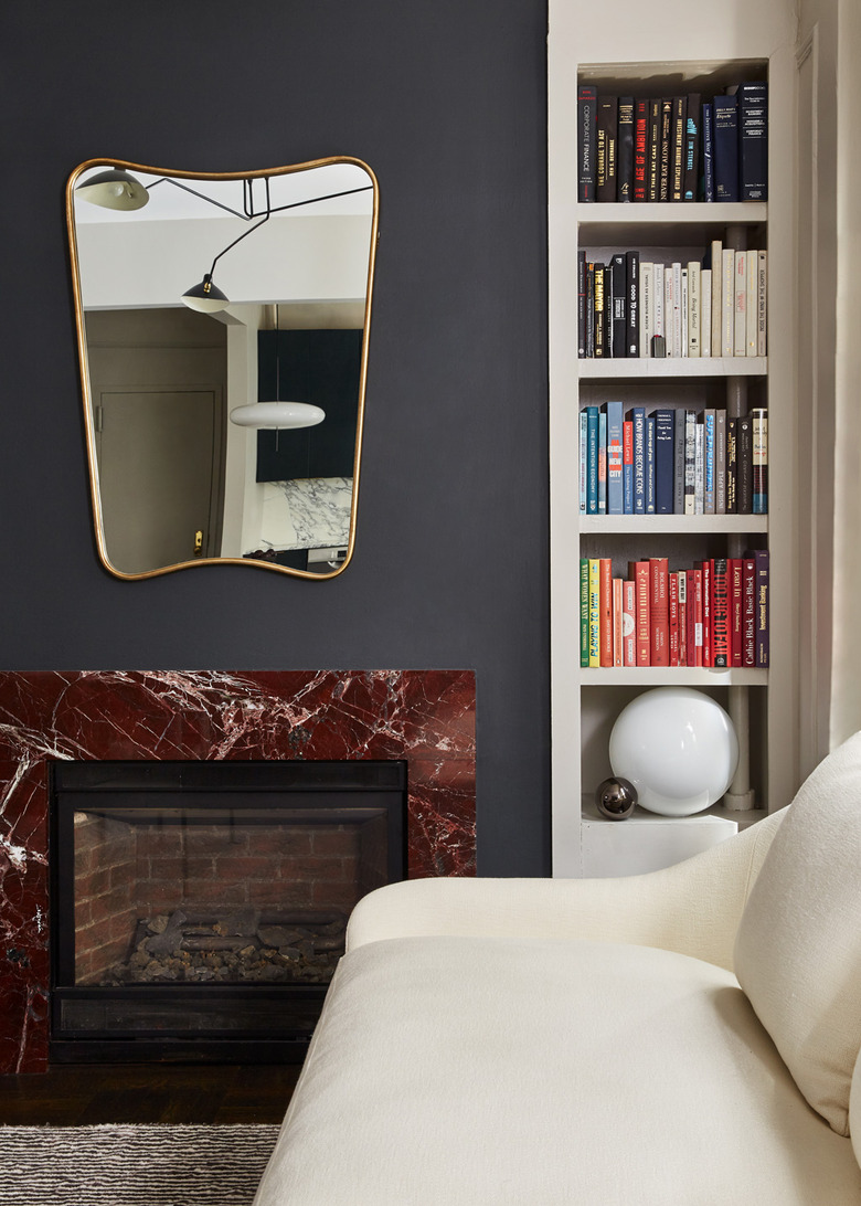 Though not for the faint of heart, a dramatic jewel-tone shade like dark blue-gray lends moody vibes to a living room and instantly makes it feel like a cozy library.