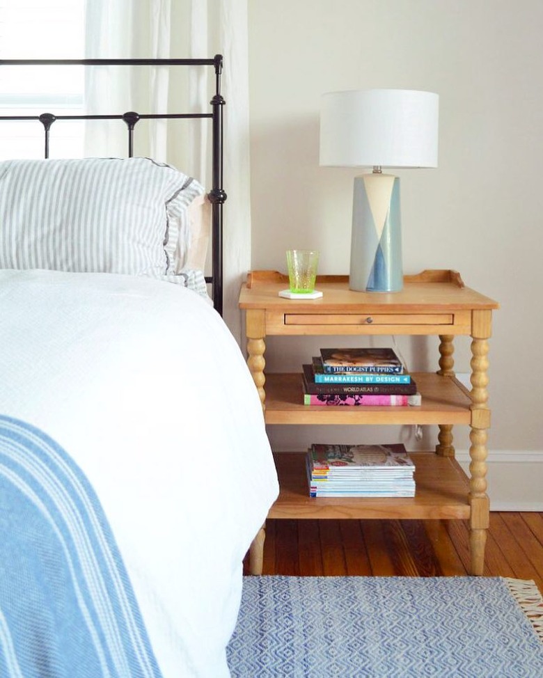 This midcentury modern bedroom lighting idea from the bloggers behind Young House Love is the perfect easy entry into retro decor. A blue and cream colored table lamp adds just a hint of midcentury flavor with geometric shapes and a clean, streamlined base. Pair with a more decorative, traditional nightstand for balance and juxtaposition.