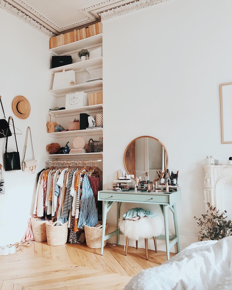 No joke, this dressing area from Kate Spiers of Kate La Vie would have us leaping out of bed in the morning just so we could have a few extra minutes alone with that mint green vanity table. Add floor-to-ceiling shelving with a clothing rack below for added storage, wall hooks for handbags, and woven baskets to keep t-shirts and tank tops neat and tidy.