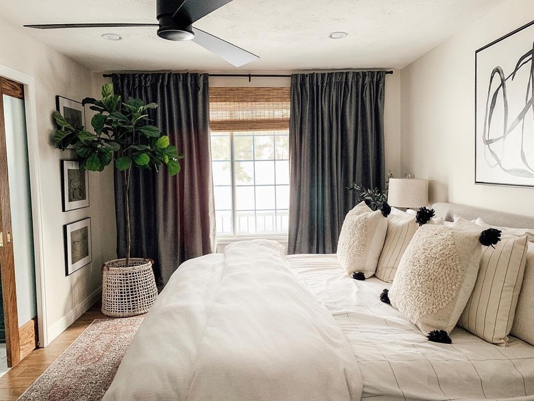 Plants instantly add color and texture to a neutral space. An empty corner, like the one pictured here from Chris Loves Julia, is the perfect place for an oversize fiddle leaf fig, which complements the otherwise subdued room. Use a woven basket as a planter for added interest and texture.