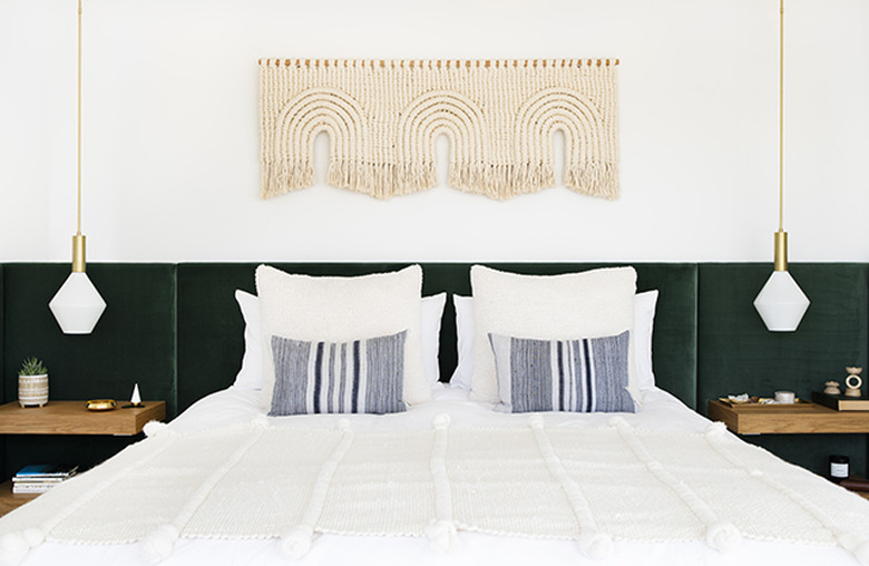 Rustic decor is the ultimate in laid-back style, so this off-centered pendant feels right at home in a bedroom designed by The Hunters Greenhouse. Snag the look by paring a simple iron bed with a natural, woven pendant for balance in a neutral bedroom, and add texture with plants and textiles for layered interest.
