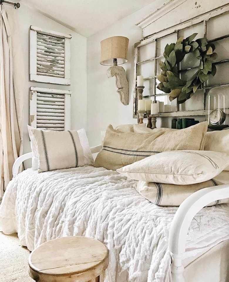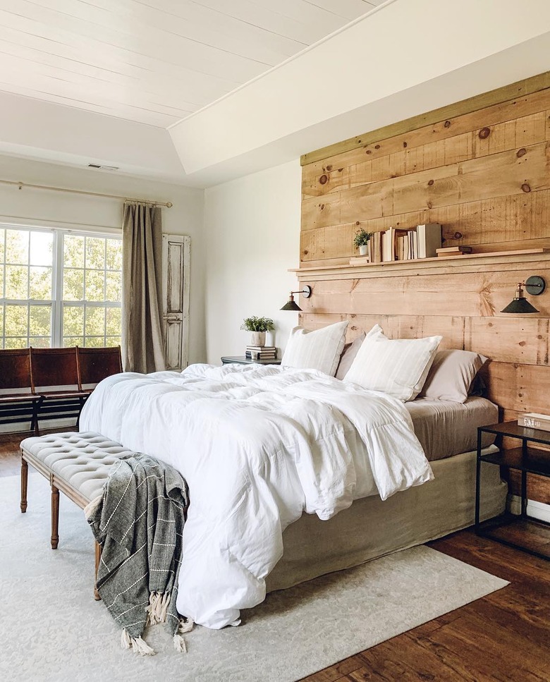 Adding wall sconces directly to a headboard made of salvaged wood à la Laura from The Simple Farmhouse elevates the entire look while maintaining a down-to-earth, rustic vibe at the same time. Opt for a vintage-inspired industrial fixture and all-white bedding for a clean and calming touch.