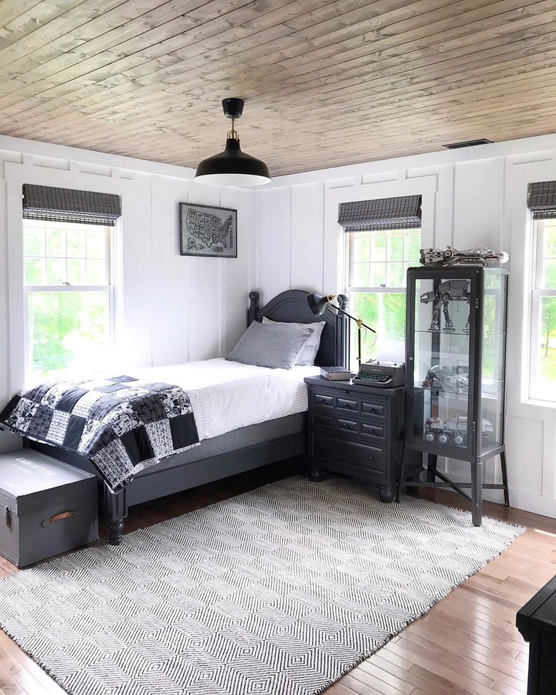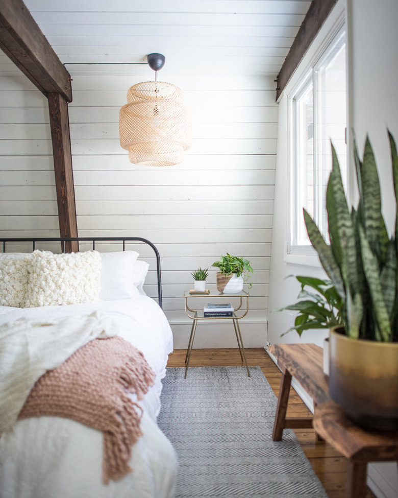The tell-tale signs of rustic decor are simple, raw materials with little-to-no frills. But the best way to accentuate this organic feeling in your bedroom is to juxtapose it, like Kay from OnceUponA1912 did in her home. Pair a beaded chandelier above the bed for a hint of glamour against materials like jute, raw wood, and black iron. And if you're able, shiplap walls and exposed ceiling beams are like icing on the cake.