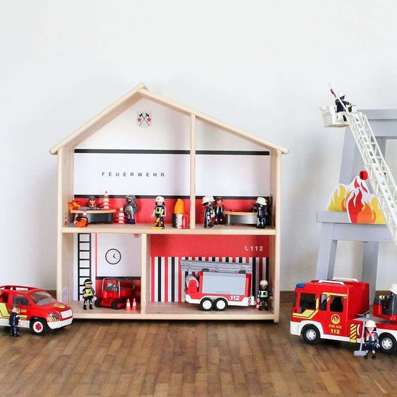 Bring in some toy fire trucks, create a ladder out of washi tape, include some red accents, and voila: DIY fire station.