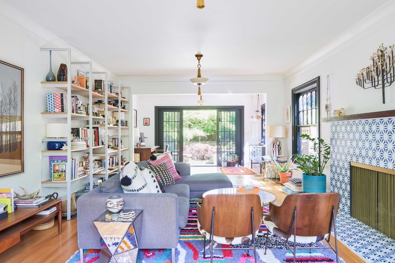 Hansen modernized the living room by installing open shelving and covering the fireplace with tile by Cemento Collection. She opened up the wall between the living room and sunroom, bringing in more light and connecting both spaces to the backyard.