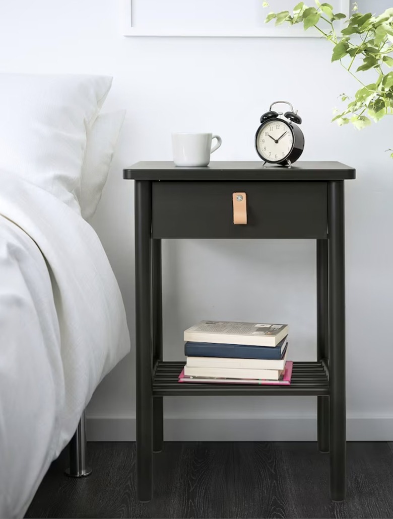 A leather pull tab pinch hits for a drawer pull, and that tiny detail is what knocks this black nightstand out of the park. The Björksnäs nightstand features a single drawer for whatever you want to keep out of sight and an open shelf on the bottom that lends an airy, barely-there feel to this adorable piece of furniture.