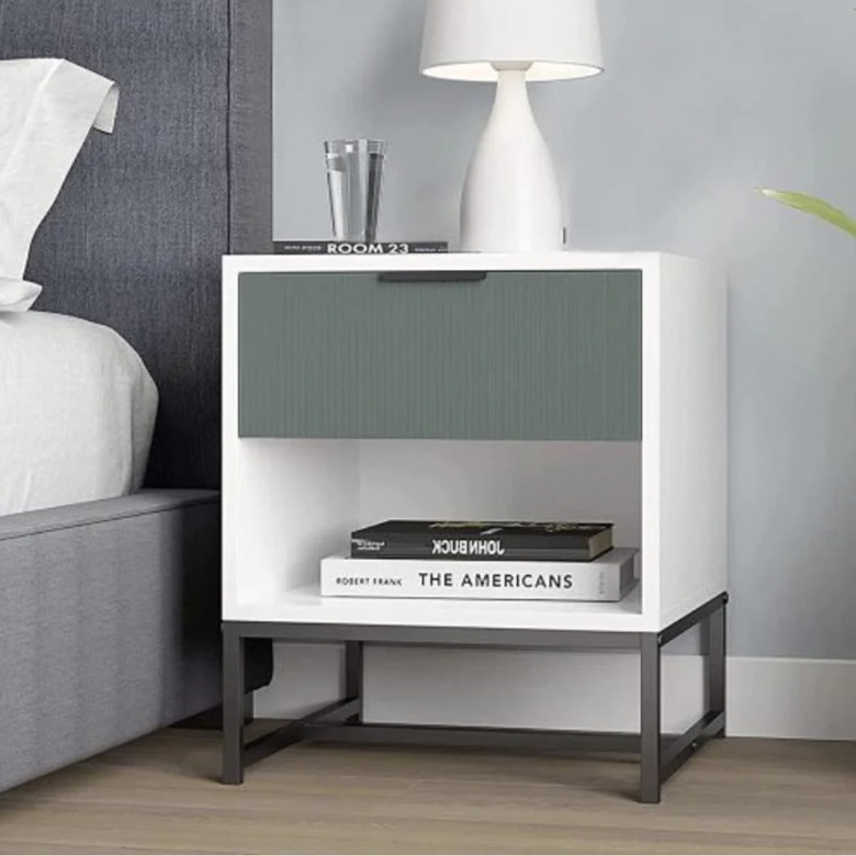 10. Otis White and Green Wood Nightstand Side Table Steel Frame with Shelf and Drawer, $51.99