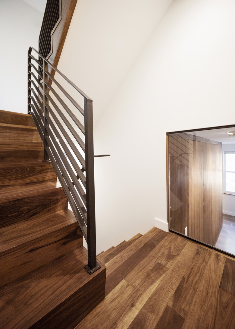 The solid walnut staircase with its iron rail is mostly concealed ...