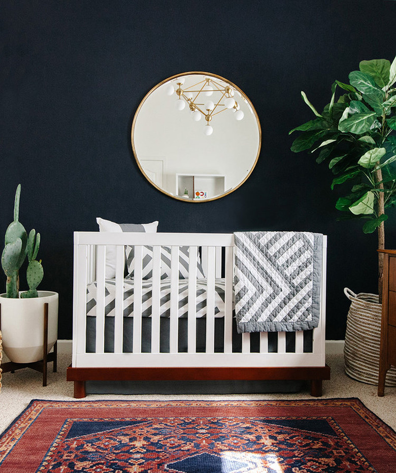 We love light blue in the nursery, but we're also really digging navy these days. The bold color is actually quite comforting and can make a nursery feel like a cozy cocoon. You can choose to showcase it on an accent wall, which is what Alexandra of AVE Styles did in this nursery, or you can go to town and cover the whole space in the dramatic shade.