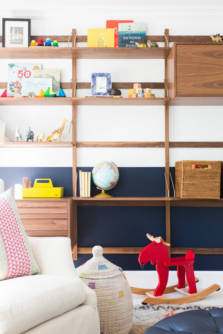 In this boho playroom, Paige of The Love Designed Life put a storage unit with cubbies to work along with on-trend woven baskets. We've also spotted clever parents who utilize IKEA's Trofast Storage System in the playroom, and the result is a storage area that's customizable and impeccably cool.