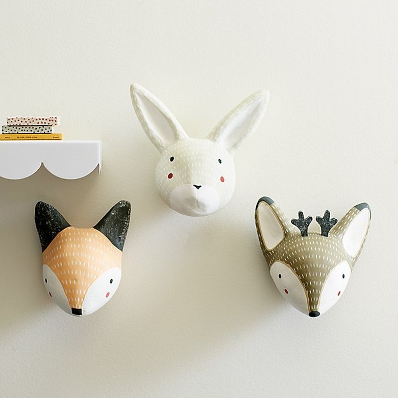 Looking for a gender-neutral nursery idea? Add some friendly faces to your baby's room. Sculptural wall-mounted animals of all sorts — particularly woodland creatures like foxes, bears, and bunnies, but lions and giraffes, too — are trending, especially when stuffed or made out of papier-mâché, like these whimsical friends from Crate & Kids. (Also? Add a mobile.)