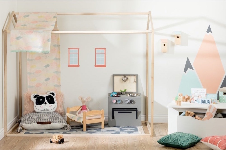 A Scandi-style wooden frame provides endless fort possibilities: Drape the "roof" with blankets and sheets to create a tucked-away hangout spot. Outfit with a mini kitchen for playing house, or place around a mattress for a cozy sleeping spot.
