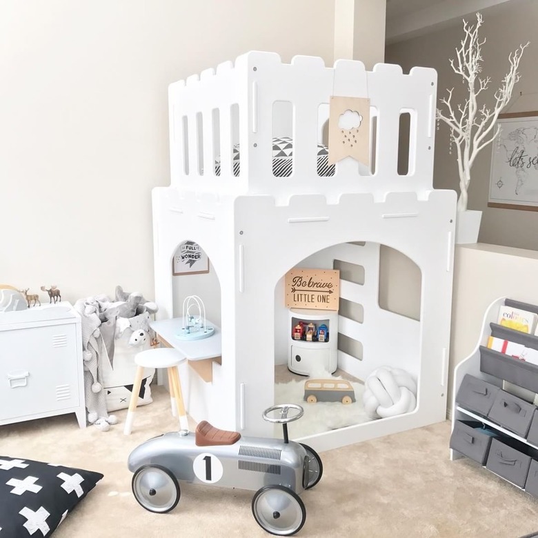 Transform the traditional bunk bed setup into an instant fort with this DIY by blogger Handmade Charlotte. (Cut holes for "windows," "doors," or peep holes.) No bunk beds? Suspend a similar drape from the ceiling or the top of a canopy bed, or just hang it over the top of a table to create an under-table fort. If you want to go old-school, an old sheet with holes cut out will work just as well for this kids' playroom idea.