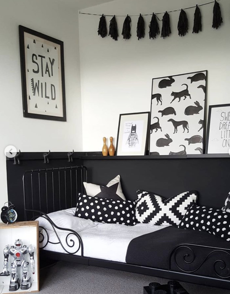 We love a graphic kids' bedroom idea, and this design by Chloe from Uber Kid is ticking all of the monochrome boxes. The white iron bed frame and pure white desk juxtaposed against jet black walls create a bold design — perfect for both boys and girls.