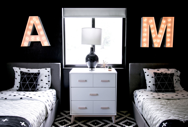 If you're painting a room black, you need to consider your lighting options. Nobody wants an ultra-dark bedroom all of the time, even if it is just for sleeping. This gender-neutral shared space created by Curio Design Studio uses white to balance the bold shade. The neon lights above the beds don't hurt, either — plus they add a dash of playful charm.