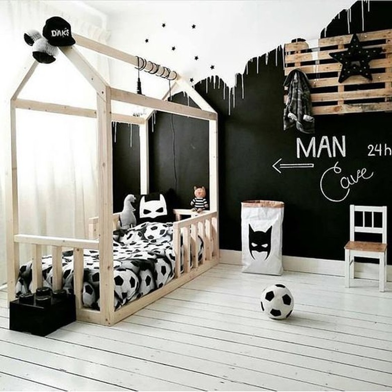 It's time to release your inner child and get creative. What would 5-year-old YOU want in your dream bedroom? We think Anne Marie from TheHomeAndTheKid has hit the nail on the head with this Scandi-chic black refuge for her son. A chalkboard wall, house-shaped bed, and graphic Batman-inspired and soccer-themed accessories keep this kid's bedroom idea playful yet super stylish.
