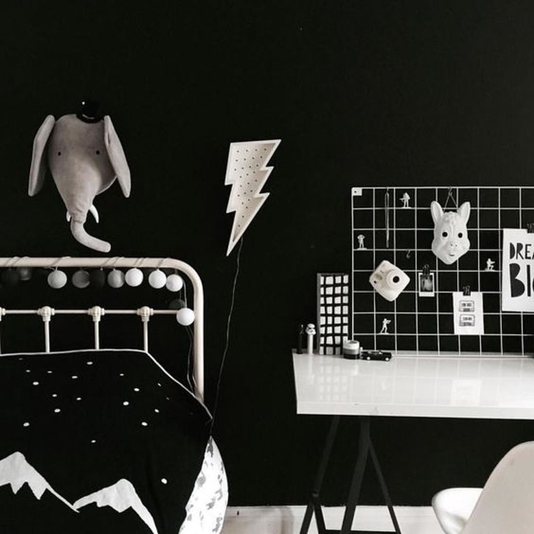 Black is a stunning base for brighter colors and works especially well with shades of neon or metallic finishes. This little girl's room by Ness from Four Cheeky Monkeys features hot pink wall decals, a bright yellow headboard, and colorful wire-frame accessories that really pop against the black backdrop.