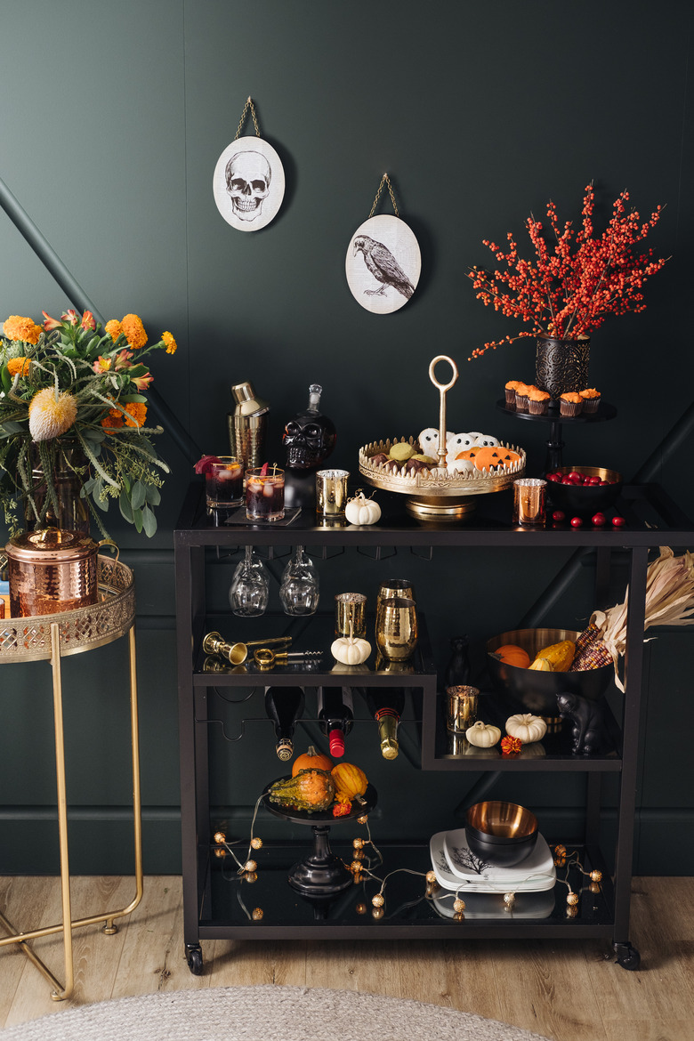 We chose a matte-black-and-gold color scheme to keep things sleek and sophisticated, creating a backdrop for traditional seasonal elements like gourds, pumpkins, and autumnal florals. The Holly & Martin bar cart is really both the star and the workhorse in this setup — lots of surface area and storage options make it super-functional, while the smoked-glass shelves subtly amplify the gleam and sparkle of the decor.