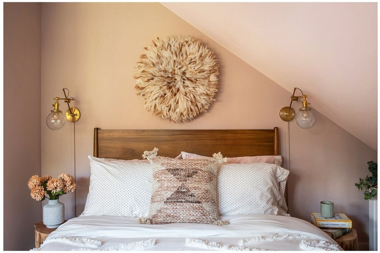 The right lighting can change the mood of a room instantly. In this farmhouse bedroom, Dichotomy Interiors chose antique-style sconces to serve as bedside lamps. Their gold-colored finish fits perfectly with the pink walls and wooden headboard, creating a warm, romantic atmosphere.