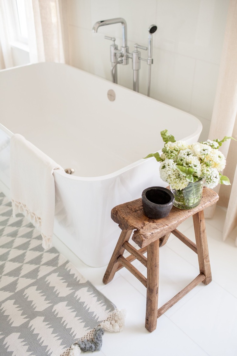 A worn, wooden bench in an otherwise modern farmhouse bathroom adds character (and a little farmhouse charm). While these pieces are best found at antique stores, don't be afraid to buy new. Add fresh flowers — as seen in this Chango & Co.-styled room — to liven up the space.